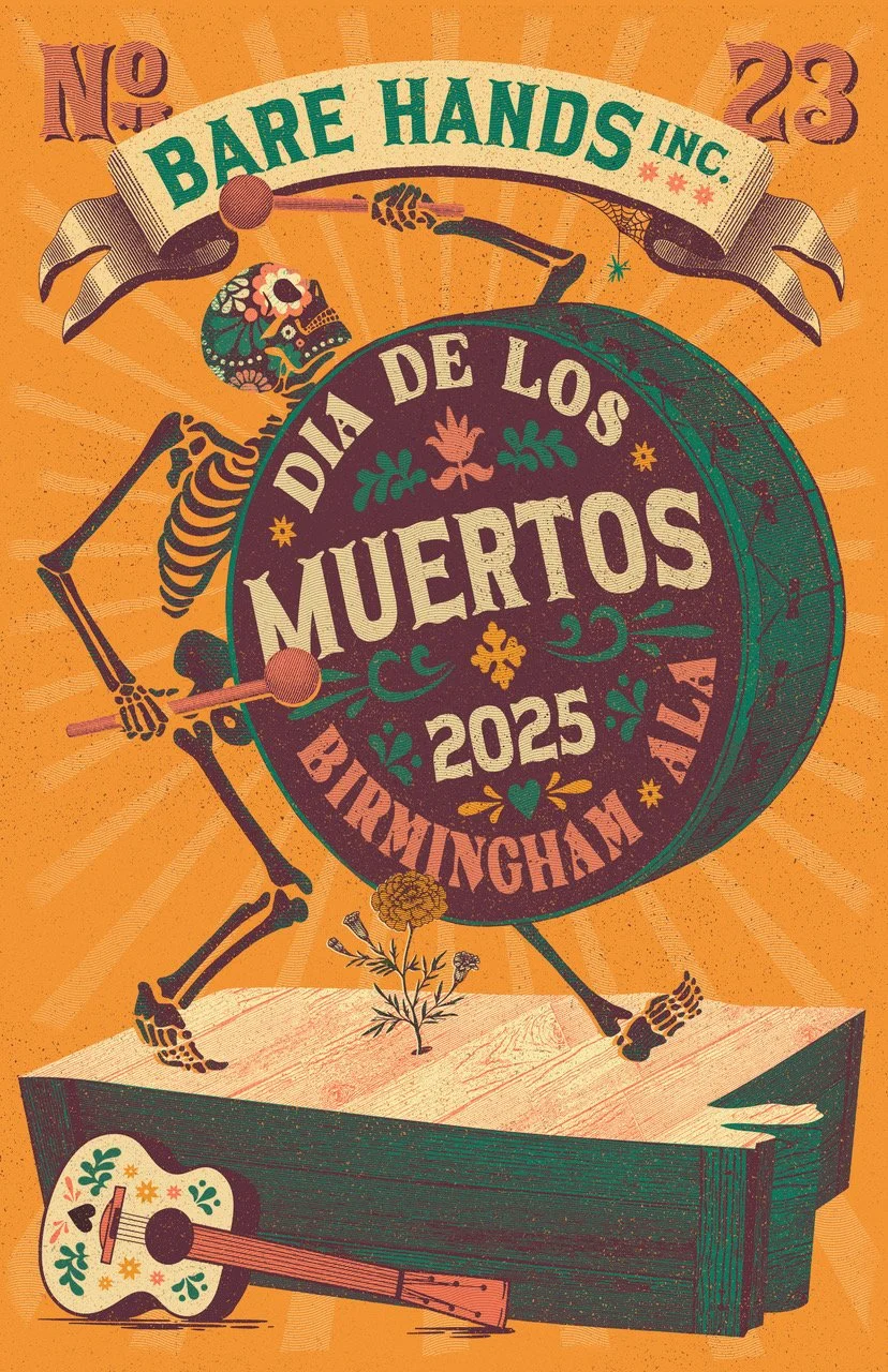 We’re proud to announce Joey Seales as our 2025 Día de los Muertos Festival Featured Artist! From the Alabama-shaped bandstand with marigolds marking Birmingham’s spot on the map to the “en calavera” drummer leading the jazz funeral-inspired parade, Joey’s design captures unique and cherished aspects of the annual commemoration.